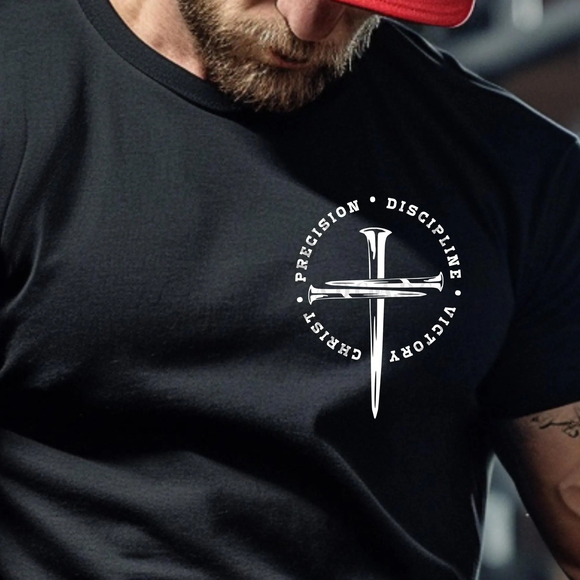 Elevate your gym routine with this powerful Christian workout shirt. Featuring a unique cross made of nails and the motivating message "Precision. Discipline. Victory. Christ.," this tee is more than just apparel—it's a statement of faith and inner strength.